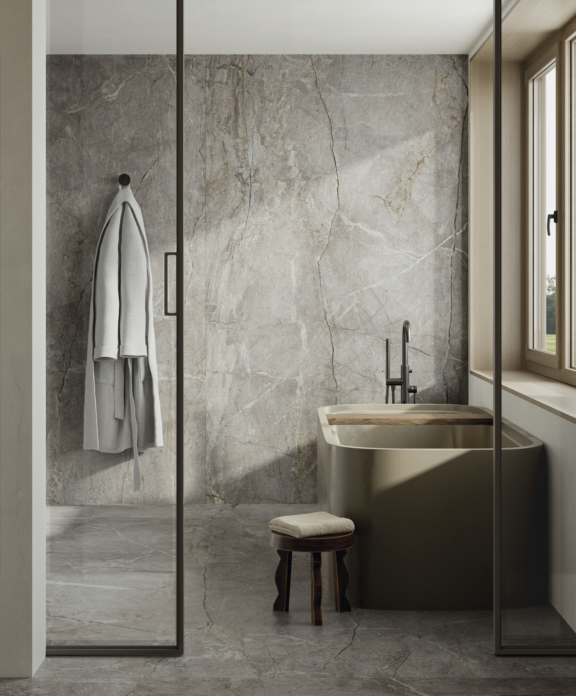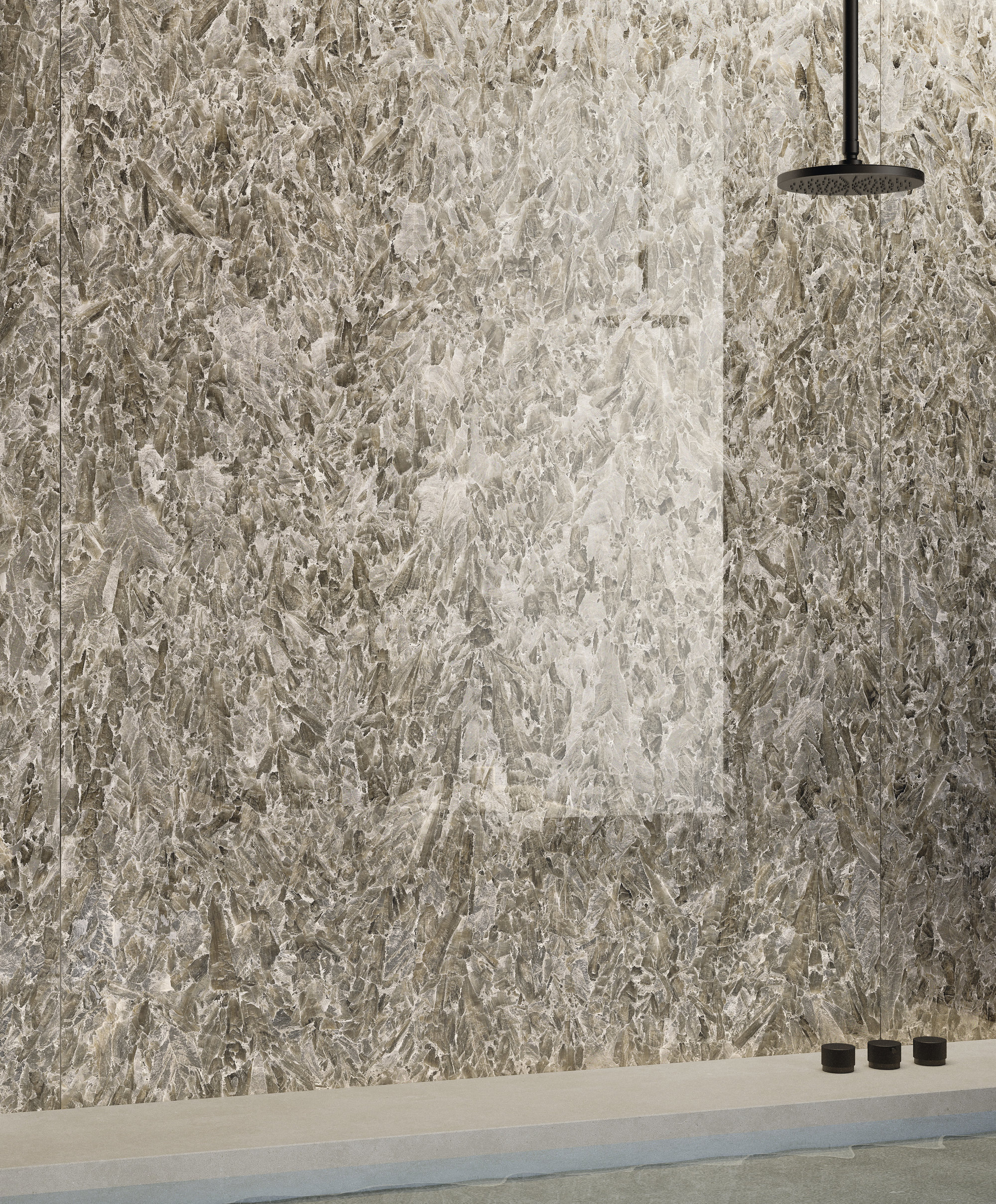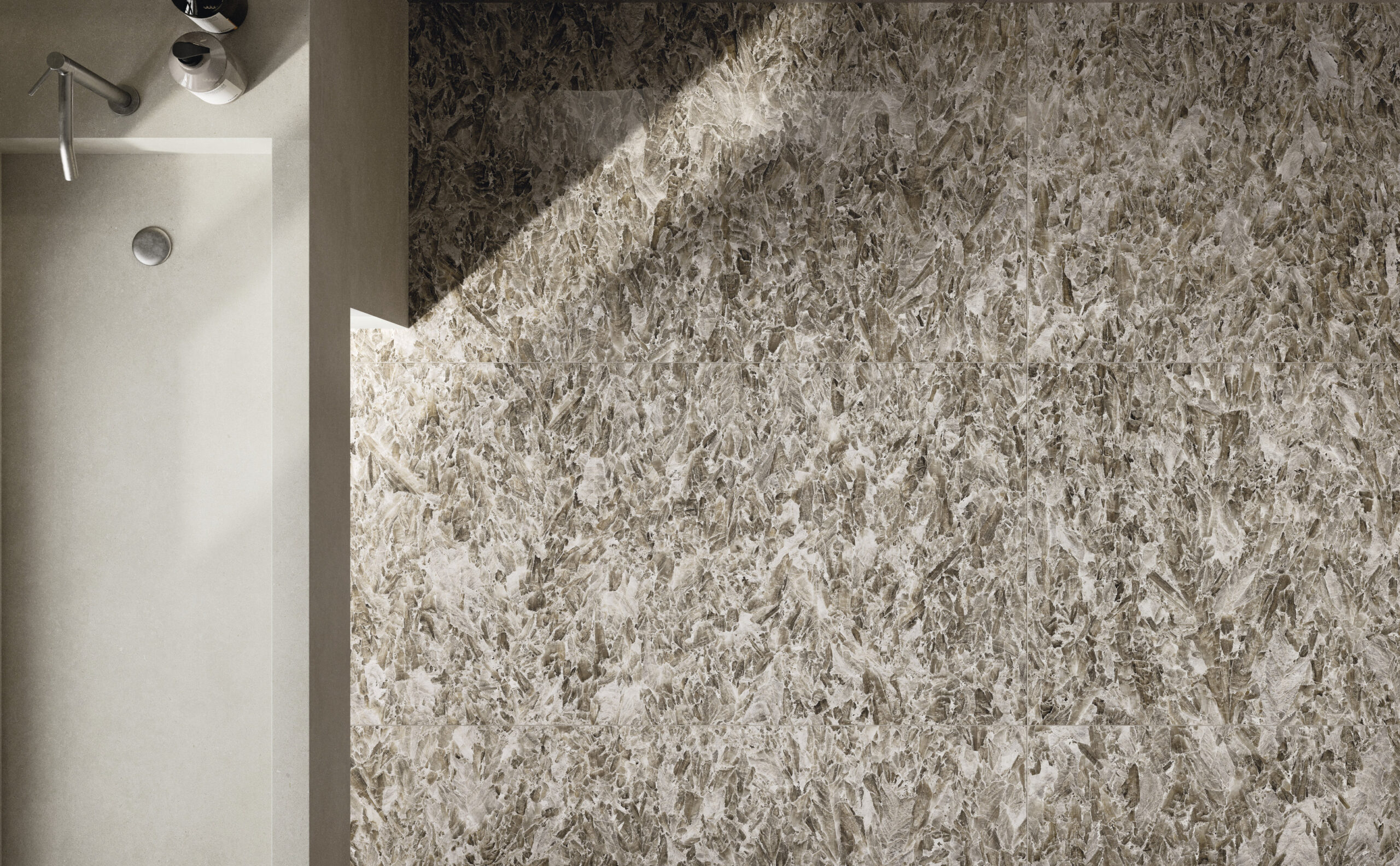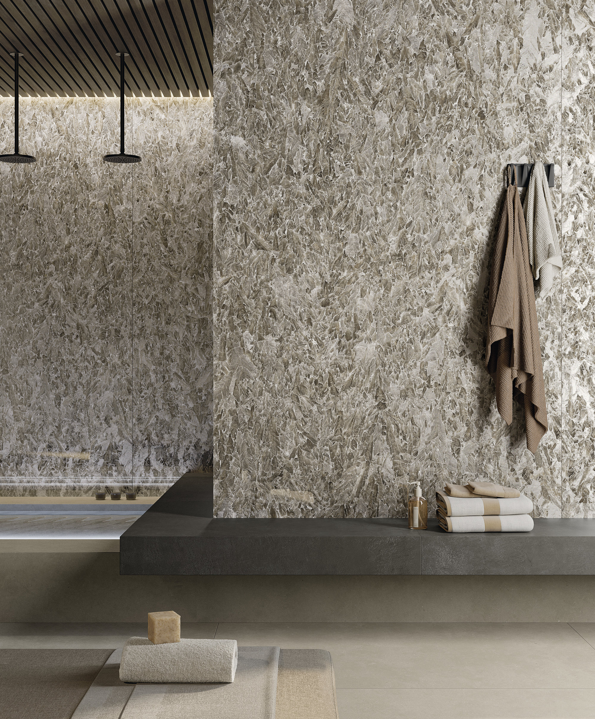 Die Oberflächen von Fiandre und Sapienstone entstehen aus dieser Vision. Materialien, die die archetypische Kraft des Steins und die Raffinesse des Marmors tragen und sie in zeitgenössische, langlebige Texturen übersetzen. Die Materie wird zur Stimme, fähig, Stimmungen zu suggerieren, innere Landschaften zu evozieren und neue Erzählungen für einen Raum zu inspirieren, der dem tiefsten Wohlbefinden gewidmet ist.