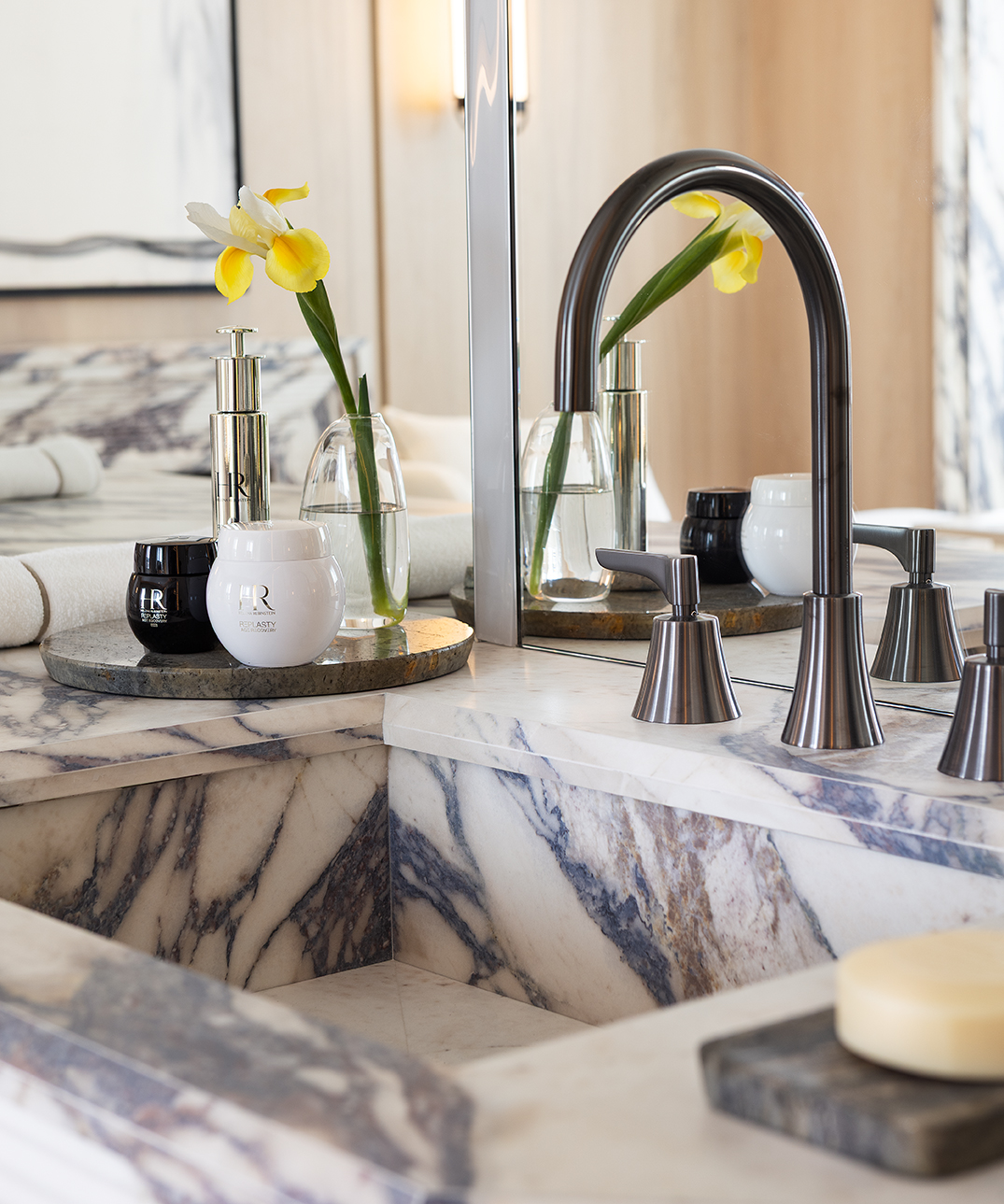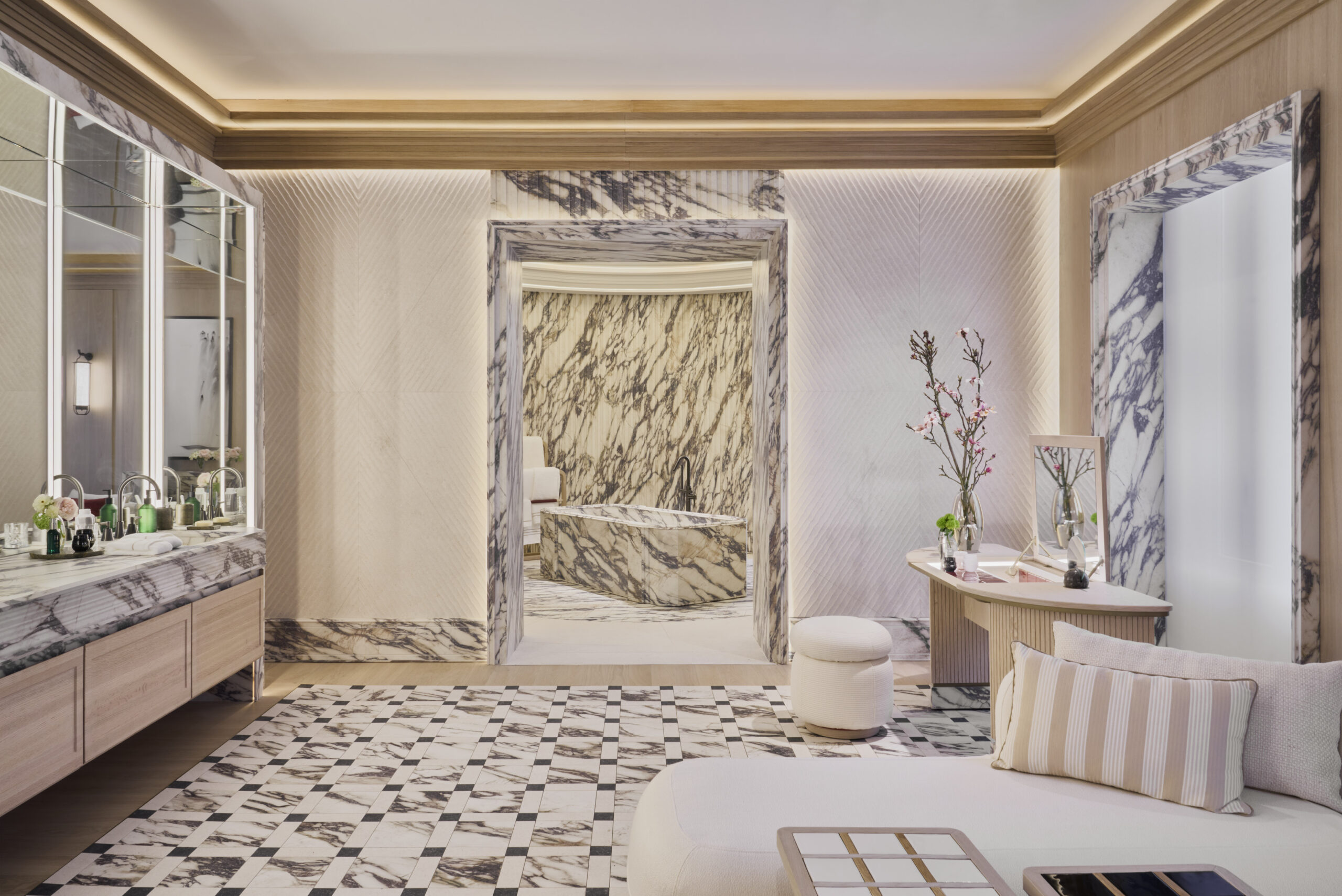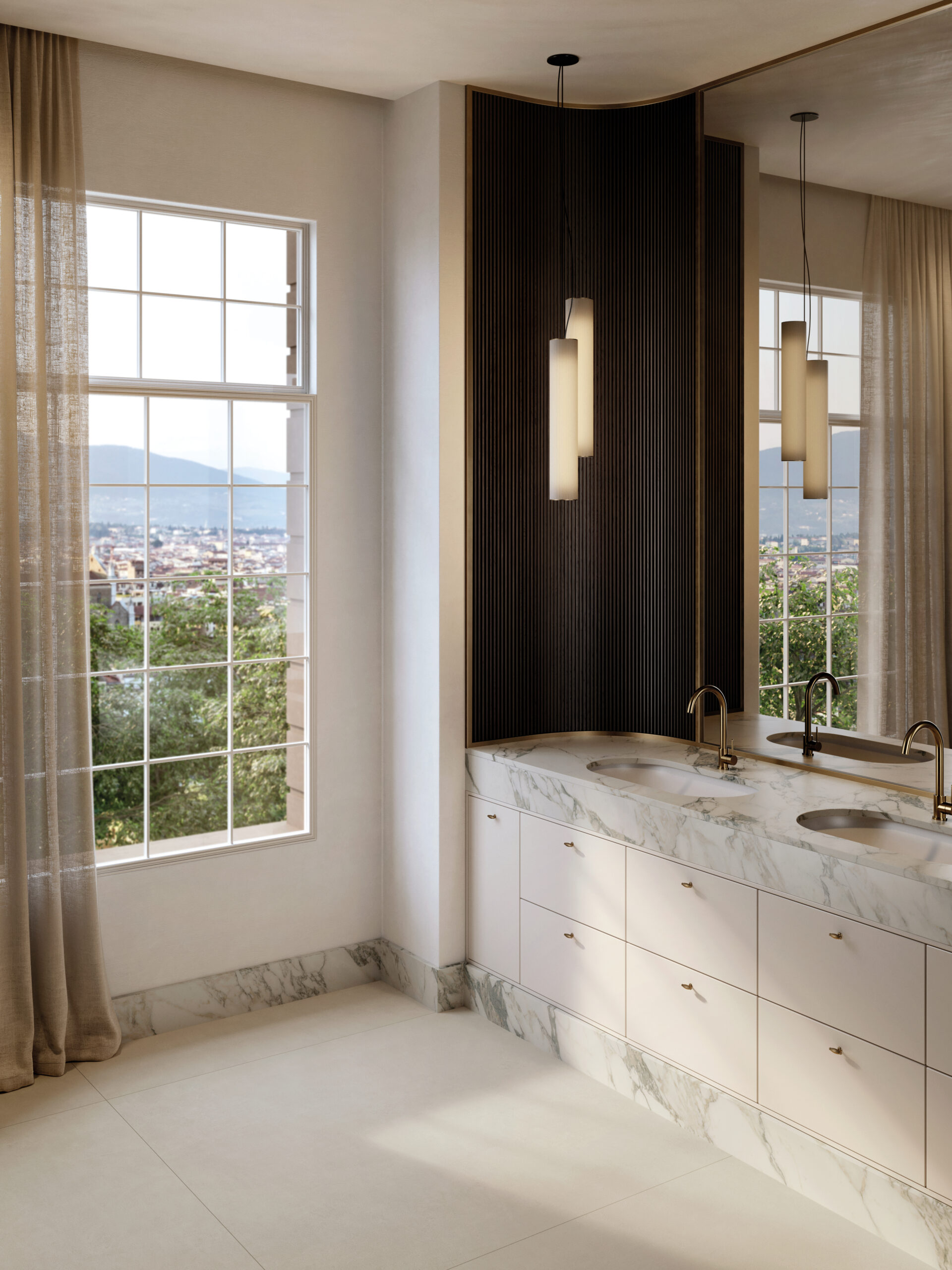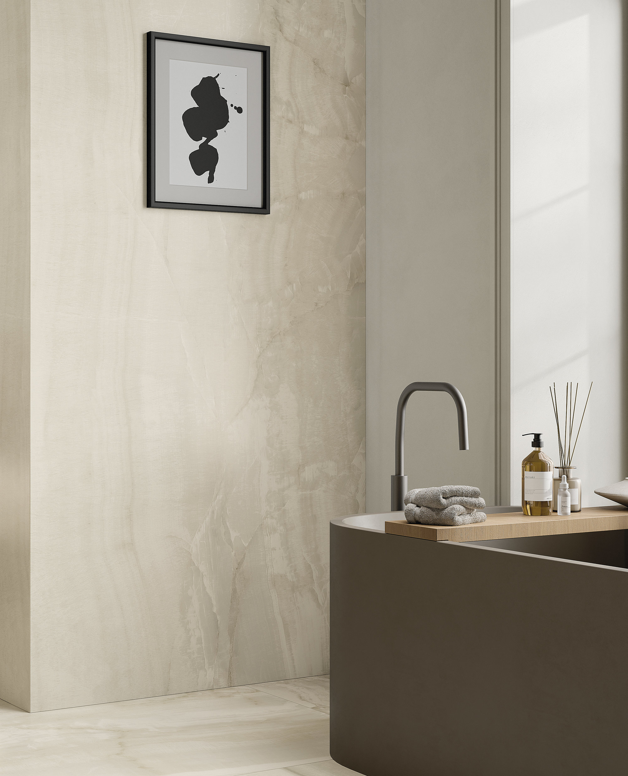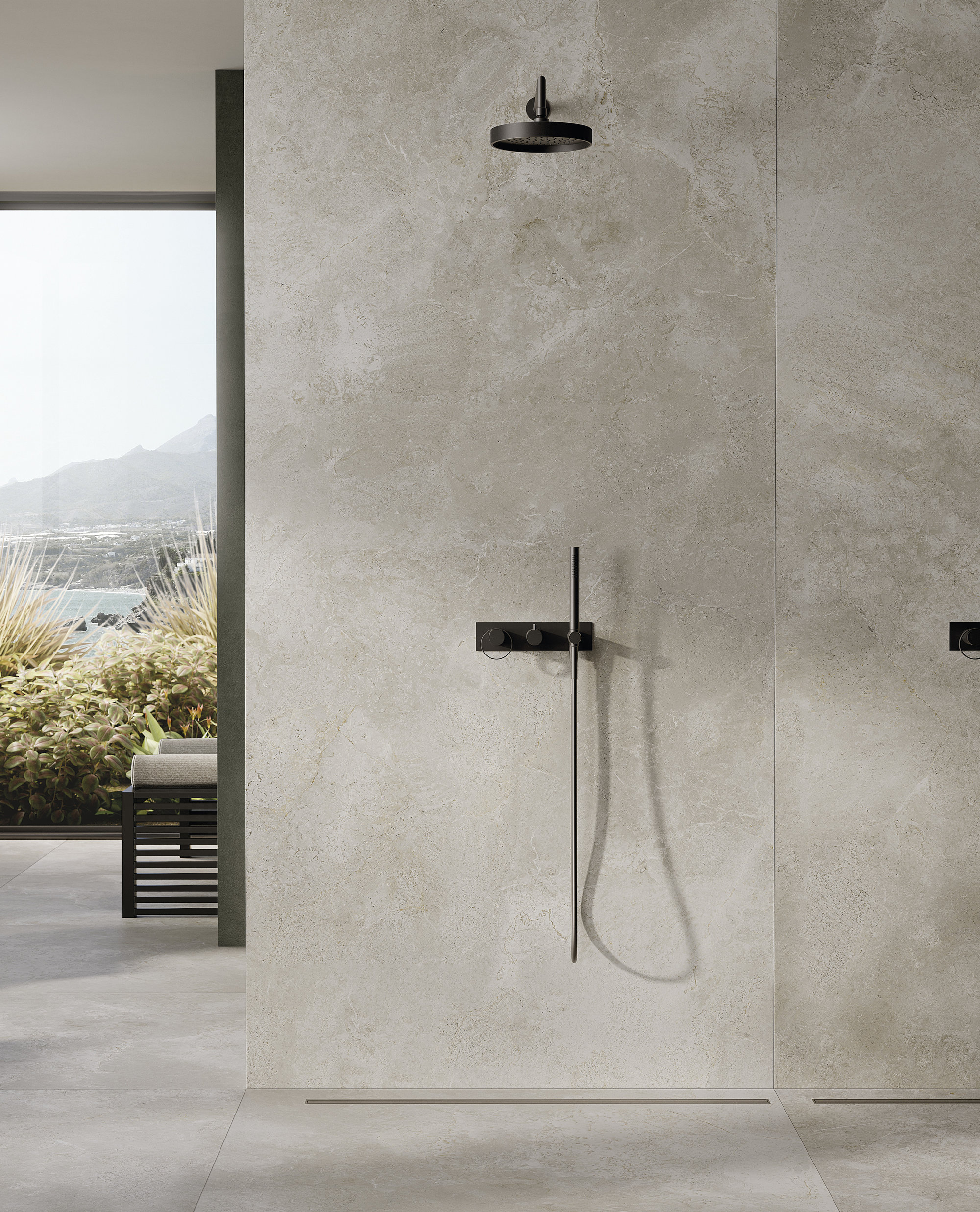 Die Oberflächen von Fiandre und Sapienstone entstehen aus dieser Vision. Materialien, die die archetypische Kraft des Steins und die Raffinesse des Marmors tragen und sie in zeitgenössische, langlebige Texturen übersetzen. Die Materie wird zur Stimme, fähig, Stimmungen zu suggerieren, innere Landschaften zu evozieren und neue Erzählungen für einen Raum zu inspirieren, der dem tiefsten Wohlbefinden gewidmet ist.