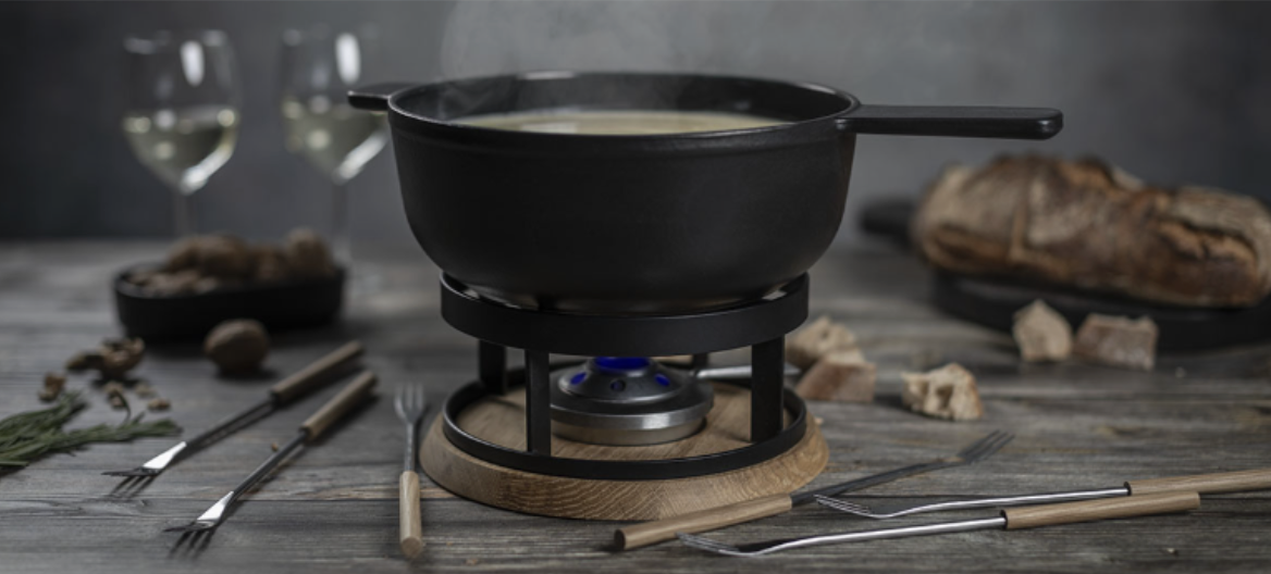 Warmes Eichenholz und edles schwarzes Gusseisen – eine Liaison aus Materialien mit Charakter. Das Caquelon verleiht dem Tisch einen modernen Industrial-Look, während die gleichmässige Wärmeverteilung dafür sorgt, dass das Käse- oder Fleischfondue besonders cremig und genussvoll bleibt. Der praktische Gegengriff des Caquelons macht das Handling angenehm und sicher. Rechaud, Caquelon und Gabeln sind optisch aufeinander abgestimmt. Designt wurden die zeitlos schlichten Sets in der Schweiz – für ein elegantes Fonduevergnügen.