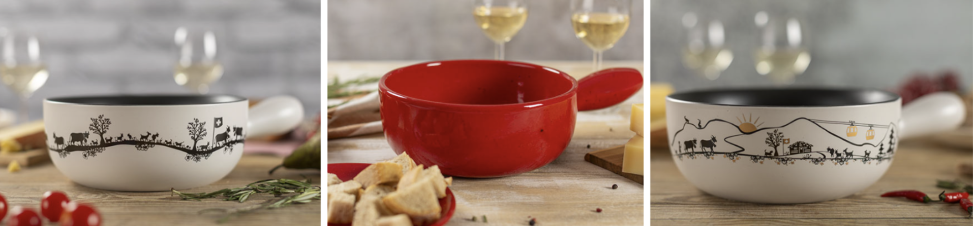 Im Caquelon rühren – das ist Entschleunigung pur. APPENZELL ist eine liebevolle Hommage an Tradition und Landschaft. GONDEL entführt zu alpinen und kulinarischen Höhenflügen. Und das klassische ROUGEMONT – mit zugehörigen Tellern – setzt ein minimalistisches Statement. Diese Caquelons aus Keramik bringen puristische Eleganz und ein Stück Schweizer Bergwelt direkt ins Esszimmer. Mit heiteren Designs, verlässlicher Qualität und fairem Preis sorgen sie für Geselligkeit für jedes Budget.