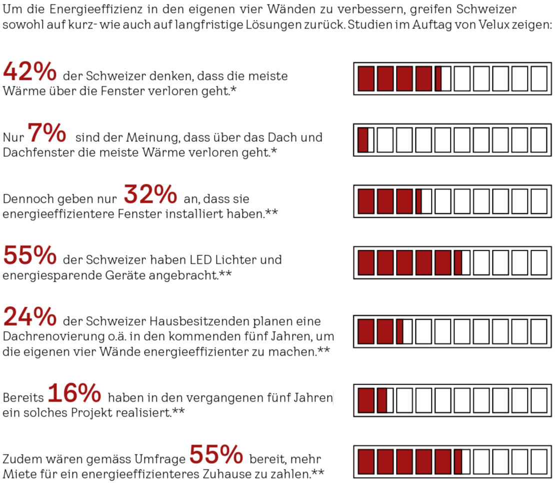Doch gemäss einer von Velux beauftragten Studie wissen nur 54 % der Schweizerinnen und Schweizer, dass Energieeffizienz auch Wohlbefinden und Gesundheit beeinflusst. Der Dachfensterspezialist Velux weiss, welche kurz- und langfristigen Massnahmen sinnvoll sind.