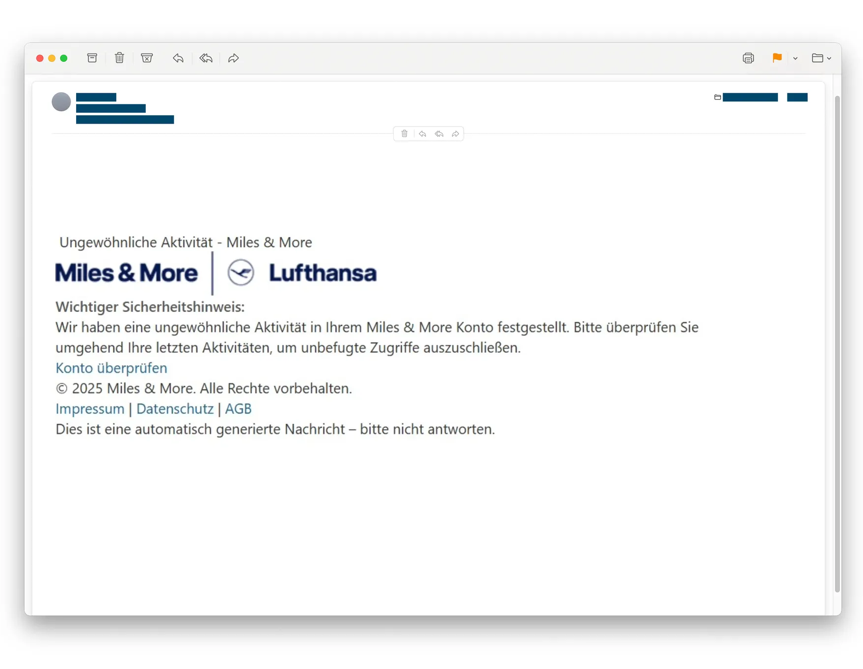 - Prüfen Sie im Zweifel direkt bei Miles & More oder Lufthansa nach, ob das E-Mail echt ist.
